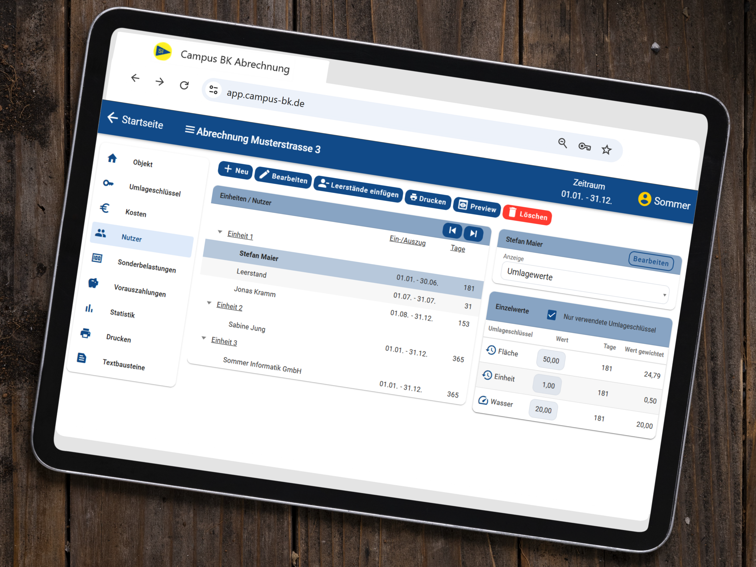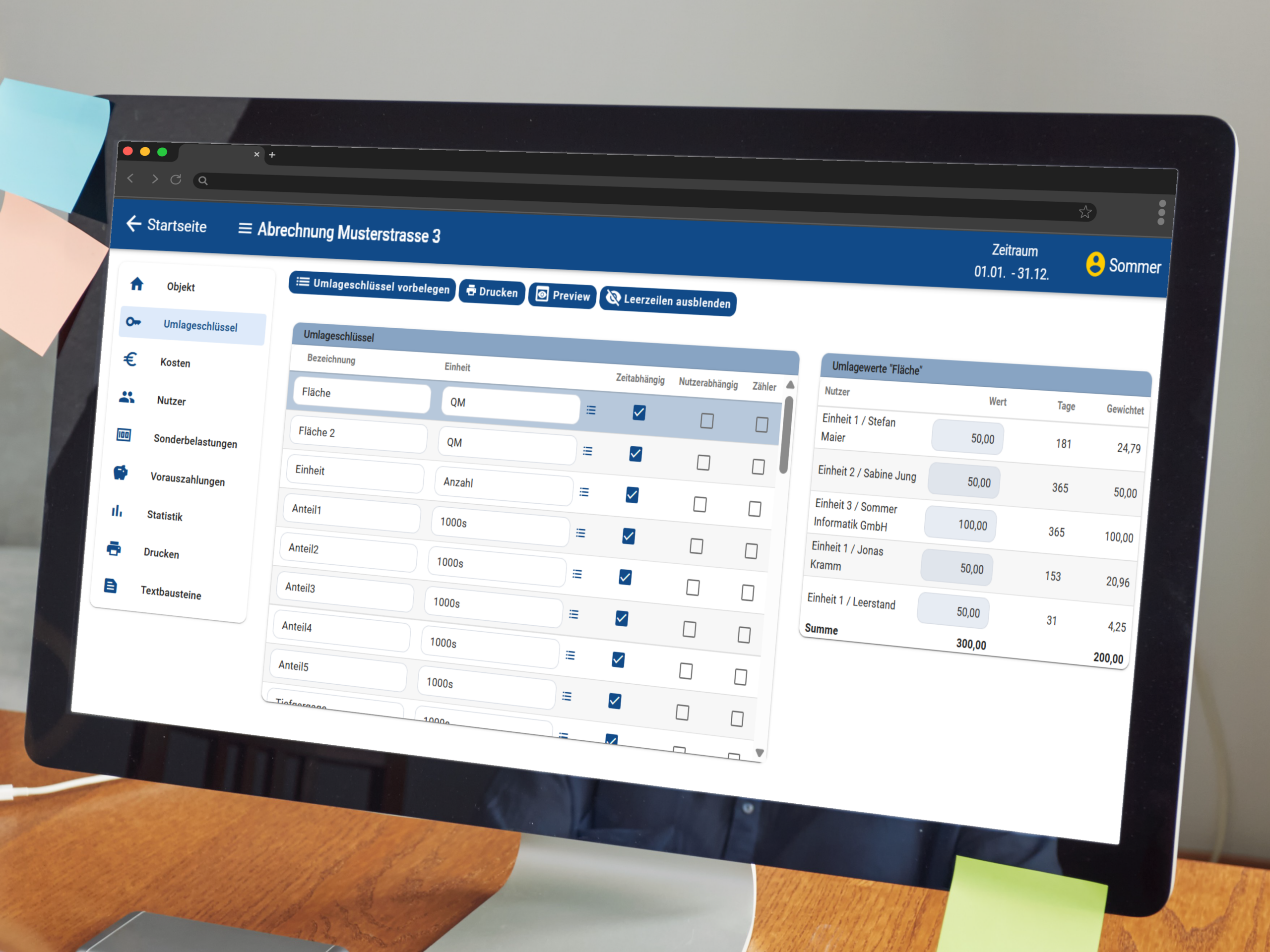 Die Software legt beim Erstellen einer neuen Abrechnung automatisch Standard-Umlageschlüssel an. Diese können individuell angepasst werden – z. B. nach Fläche, Personen, Einheiten oder Verbrauch. Nutzerwerte lassen sich komfortabel erfassen und prüfen, sodass Kosten korrekt und nachvollziehbar verteilt werden.