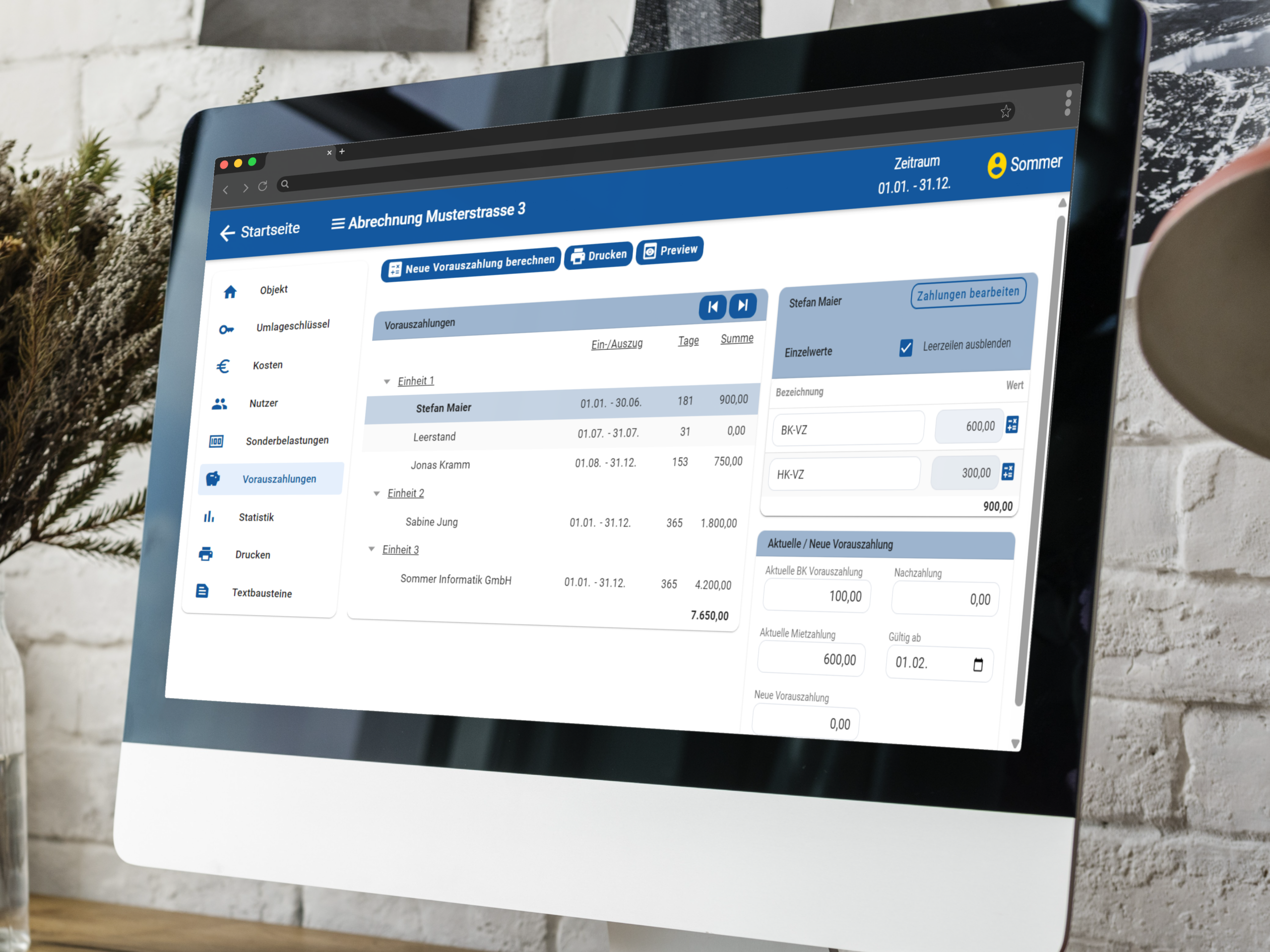 Erfassen Sie Sonderbelastungen gezielt pro Nutzer oder übernehmen Sie diese gesammelt für mehrere Einheiten. Vorauszahlungen lassen sich individuell hinterlegen und werden automatisch in der Abrechnung berücksichtigt – inklusive möglicher Nachzahlungen oder Guthaben.